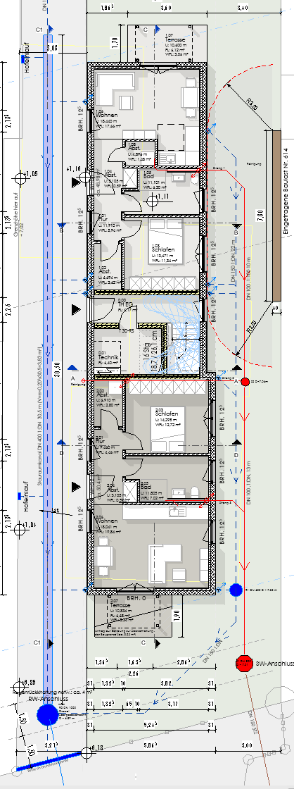 Herausforderung Hochspannungsleitung: Das Grundstück befindet sich im Einflussbereich von Hochspannungsleitungen der Amprion GmbH. Diese besondere Lage erforderte eine enge Abstimmung mit dem Netzbetreiber sowie eine sorgfältige Einhaltung aller relevanten Abstands- und Sicherheitsregelungen. Durch vorausschauende Planung konnte das Projekt trotz dieser technischen Herausforderung erfolgreich umgesetzt werden.