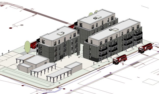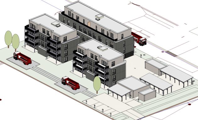 Drei Mehrfamilienwohnhäuser mit 30 Wohneinheiten & 30 KfZ-Einstellplätzen in Massiv-Bauweise mit Klinker-Fassade und HPL-Verkleidung